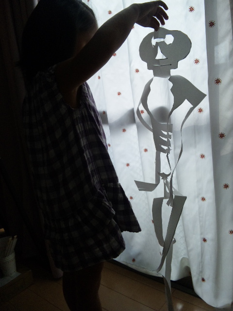 1枚の紙を切って切って…仕上がり身長は110cmの娘と同じくらいでした。